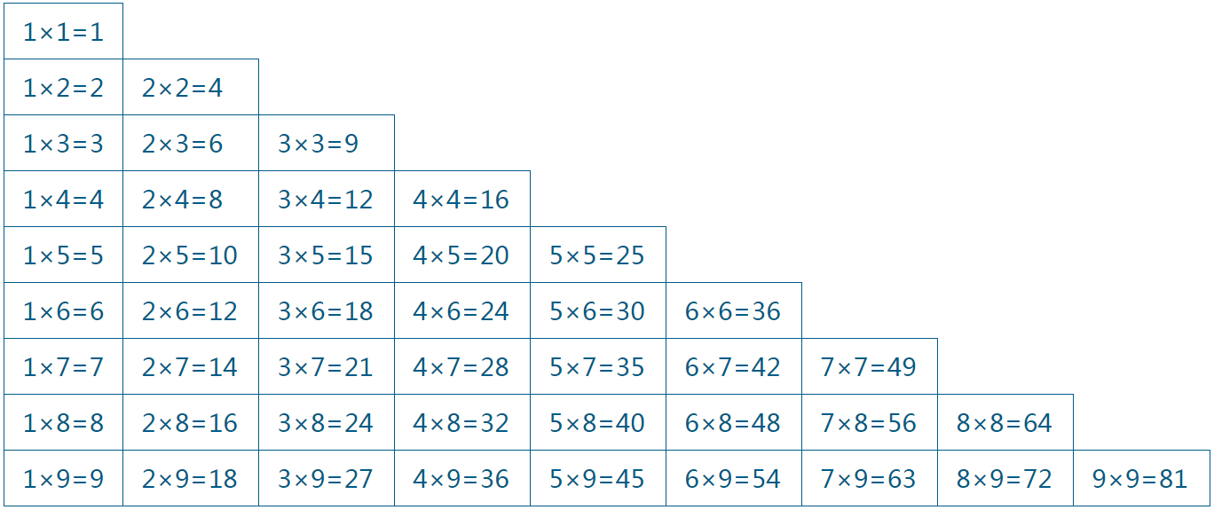 《乘法口訣表》,又叫《九九乘法口訣表》、《九九乘法歌訣》或《九九乘法表》,常被稱為“小九九”?,F在學生學的“小九九”口訣,是從“一一得一”開始,到“九九八十一”止,而在古代,卻是倒過來,從“九九八十一”起,到“二二得四”止。因為口訣開頭兩個字是“九九”,所以,人們就把它簡稱為“九九”。大約到13、14世紀的時候才倒過來像現在這樣“一一得一……九九八十一”。
