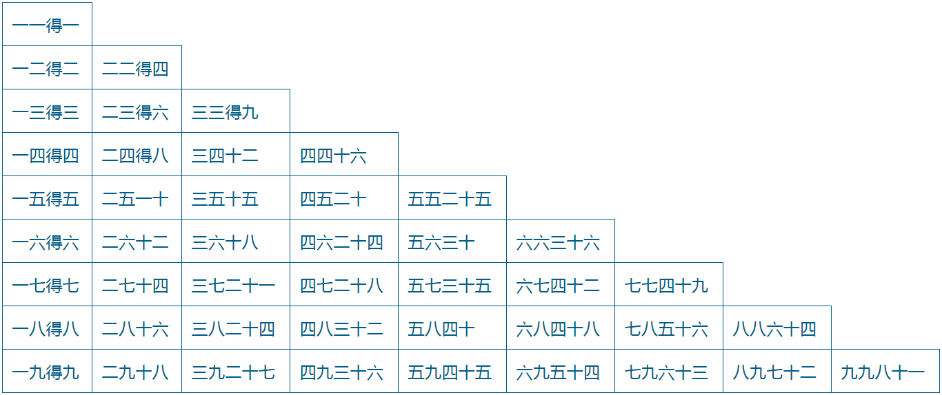| 一九得九 | 二九十八 | 三九二十七 | 四九三十六 | 五九四十五 | 六九五十四 | 七九六十三 | 八九七十二 | 九九八十一 |