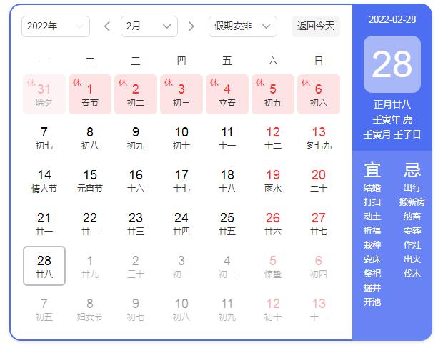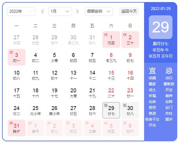2022年1月31日(除夕、周一)-2022年2月6日(初六、周日),共放假7天,其中2022年1月29日(周六)、2022年1月30日(周日)正常上班調休。