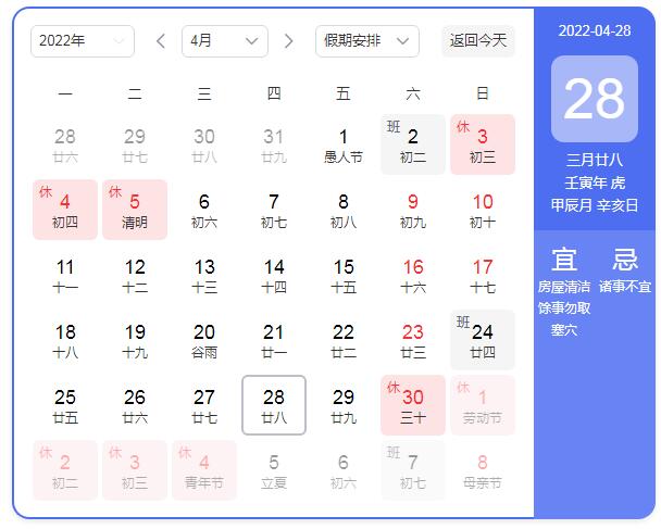 2022年4月30日(周六)-2022年5月4日(周三),共放假5天,其中2022年4月24日(周日)、2022年5月7日(周六)正常上班調休。
