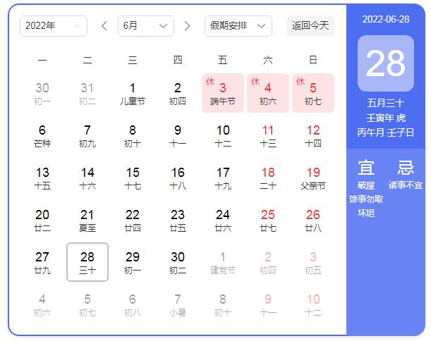 2022年6月3日(周五)-2022年6月5日(周日),共放假3天