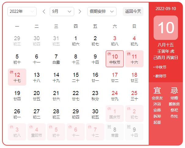2022年9月10日(周六)-2022年9月12日(周一),共放假3天。