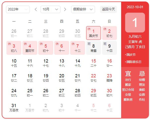 2022年10月1日(周六)-2022年10月7日(周五),共放假7天,其中2022年10月8日(周六)和2022年10月9日(周日)為正常上班調休時間。